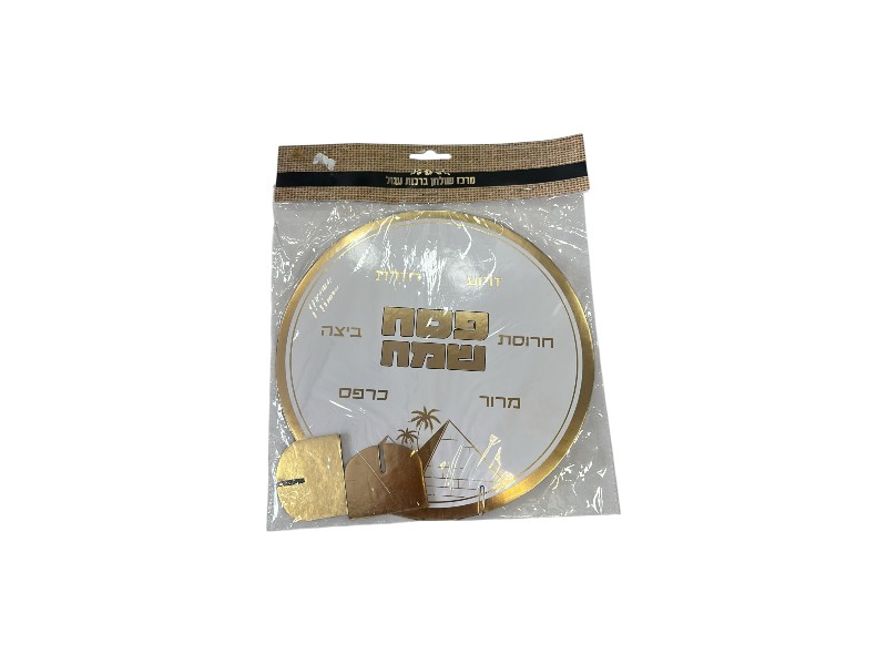 דלג לתוכןעיצוב סימבולי ומרהיב: מרכז השולחן מציג שילוב של סמלי החג האייקוניים – פירמידות ועצי דקל – המודפסים בזהב מטאלי מבריק על רקע לבן נקי.